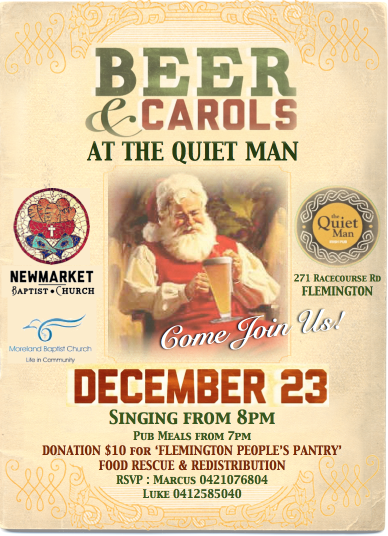 December 3, 2013 by marcuscurnow Beer & Carols at The Quiet Man Irish Pub Beer & Carols Poster Share this: Click to share on X (Opens in new window) X Click to share on Facebook (Opens in new window) Facebook Like Loading... Related